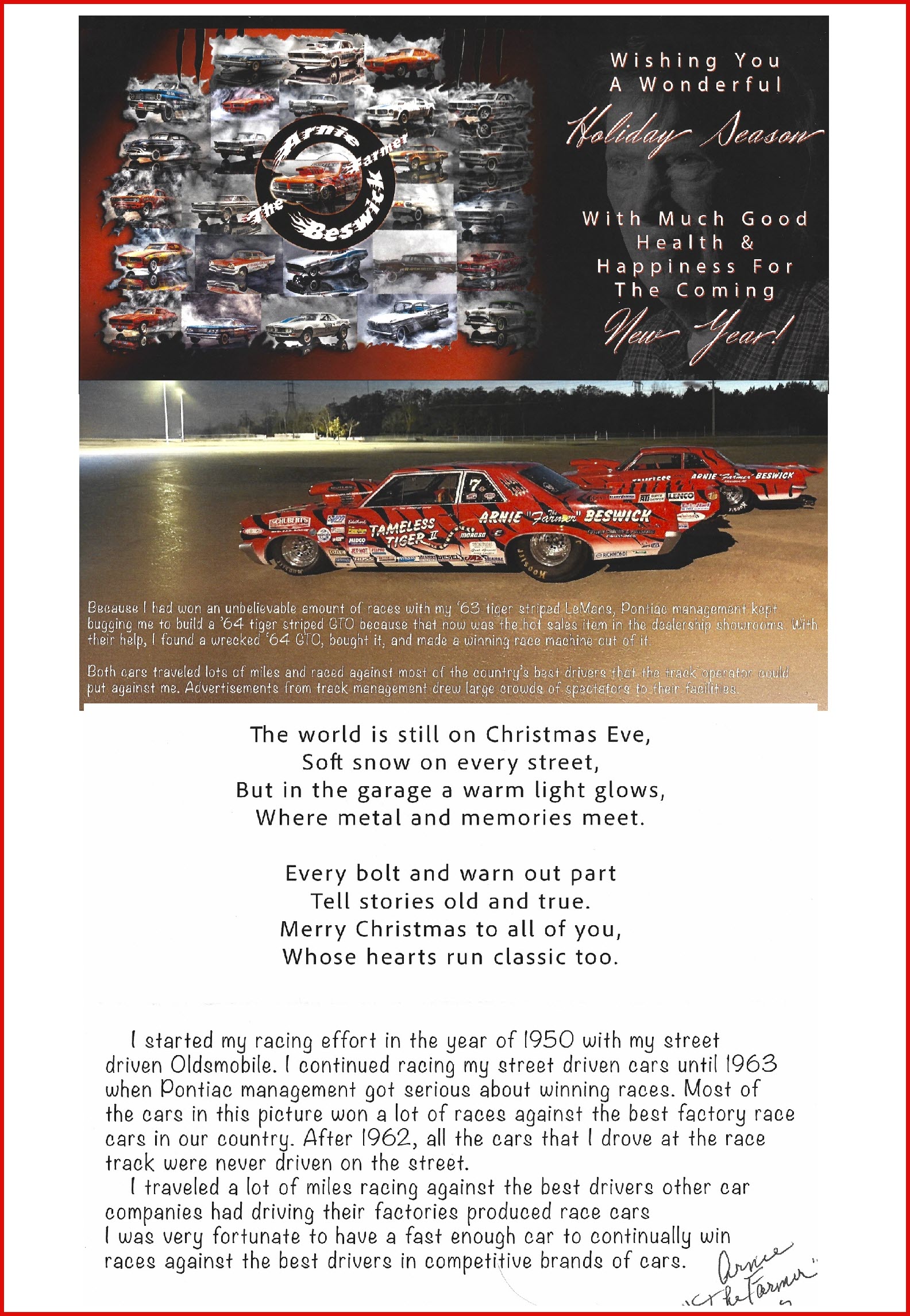 | Every year, for many years, I have received a Holiday greeting card from Arnie Beswick, the most predominate Pontiac Drag racer know to all of us, and a great ambassador for the brand. Each year his accompanying letter says he is really pleased that we are carrying on the with our race series and hopes we continue to do so. He always acknowledges that in his travels he has bumped into racers from our group and says we are a great group to be a part of. Because I know there are a tremendous number of Arnie fans in our group, I thought I would pass along to you this year's Holiday greetings. .........Steve | |||